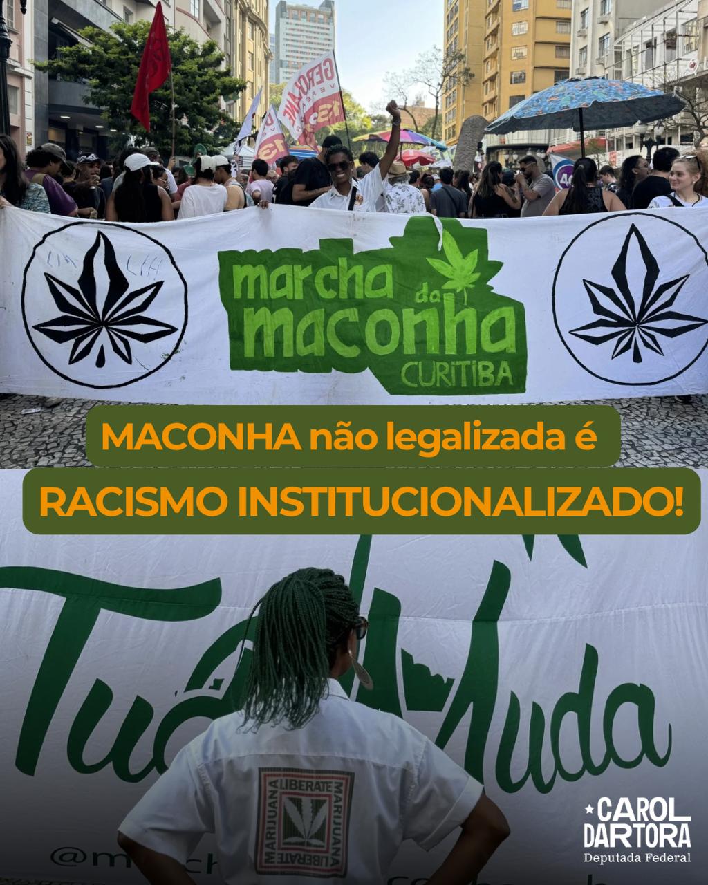 A deputada federal Carol Dartora (PT-PR) declara apoio à luta pela descriminalização da cannabis no Brasil. Para ela, a criminalização da planta tem origem e ainda hoje serve como instrumento de encarceramento em massa da população negra e periférica.